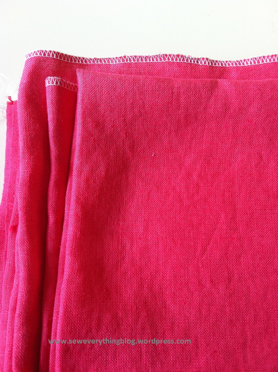 Here is my choice of fabric. No basic black for me, thank you. This is a beautiful Belgian linen, I was told by the fabric seller. “Watermelon” is the only way I can describe the color.