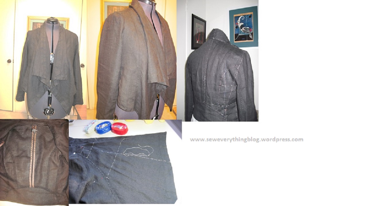 Note the details above in this composite by clicking on the picture to make it larger. The fabric is black linen, and the entire jacket has a washed look. Which makes the linen look wrinkly and chic-soft, not wrinkly and annoying. The front has no closure. All seams are serged and topstitched, except the center back seam which is pressed open and given a Hong Kong finish (seam edges encased in a bias binding). The sleeve is a two-piece, so there’s that. You will also see where I hand stitched large basting stitches to indicate the grain. It was fun to see the grain line revealed!