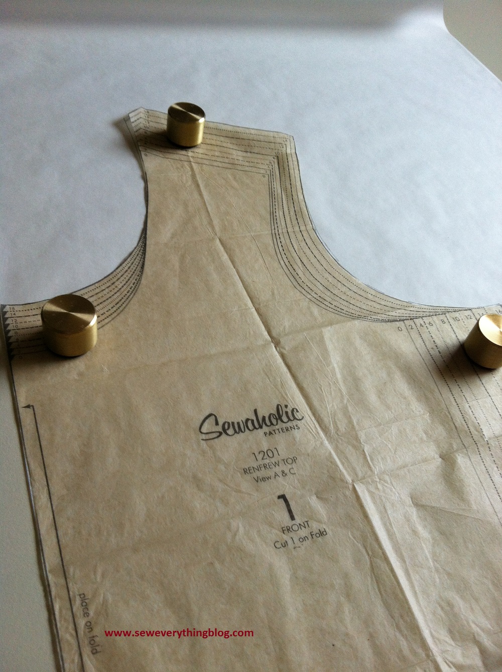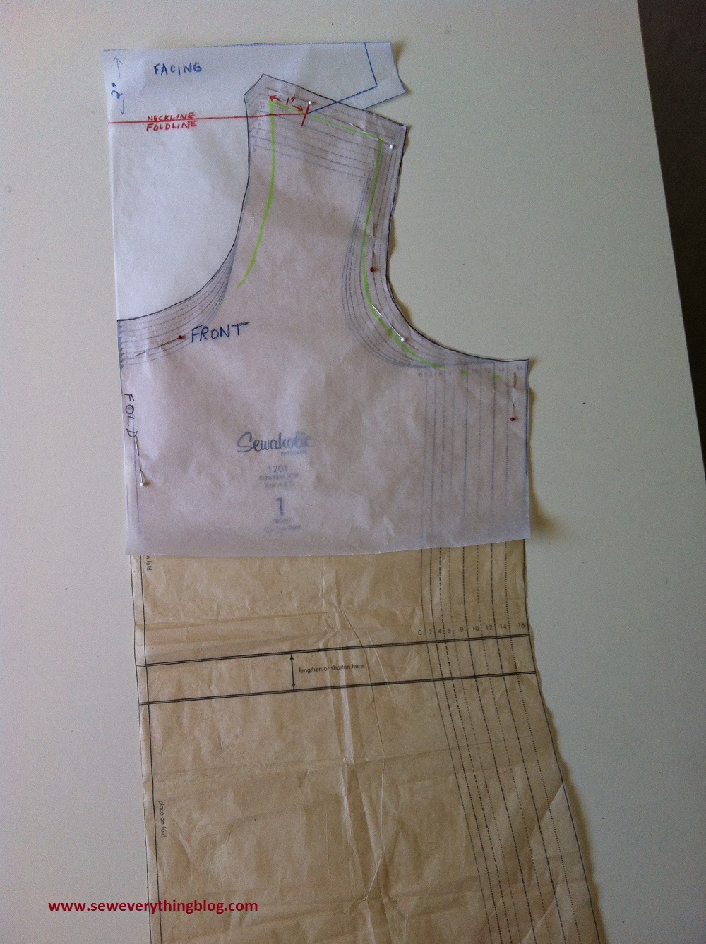 Starting with my new BFF pattern, the Renfrew from Sewaholic Patterns, I created a boatneck template. Additionally, I included the facing for the boatneck in the template to make it all one piece.