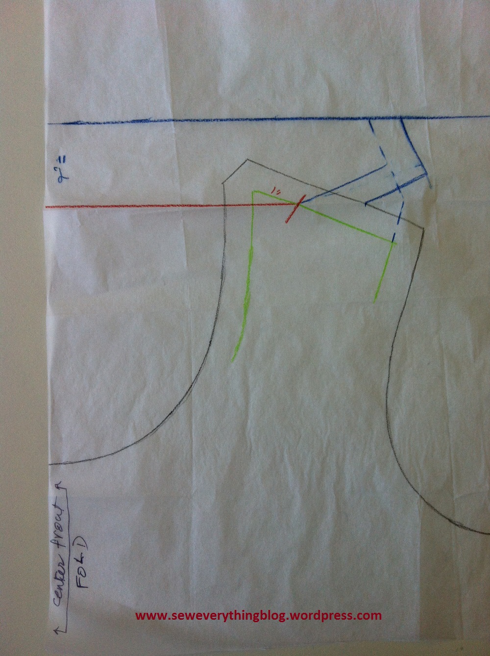 - Square off this point and the center front as shown; it’s the red line in the photo. Please ignore the blue line until later. The red line is the boatneck and the rest of it is the shoulder seam. At this point you could create a very slight curve to round out the neckline ever so slightly. Then, add an allowance to the red line so you can finish your neckline by turning and sewing .