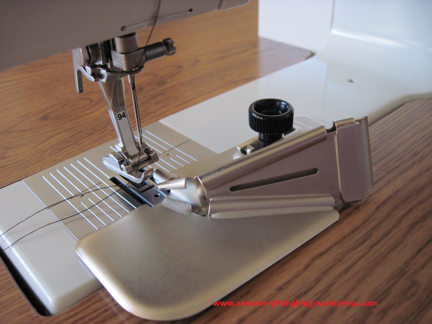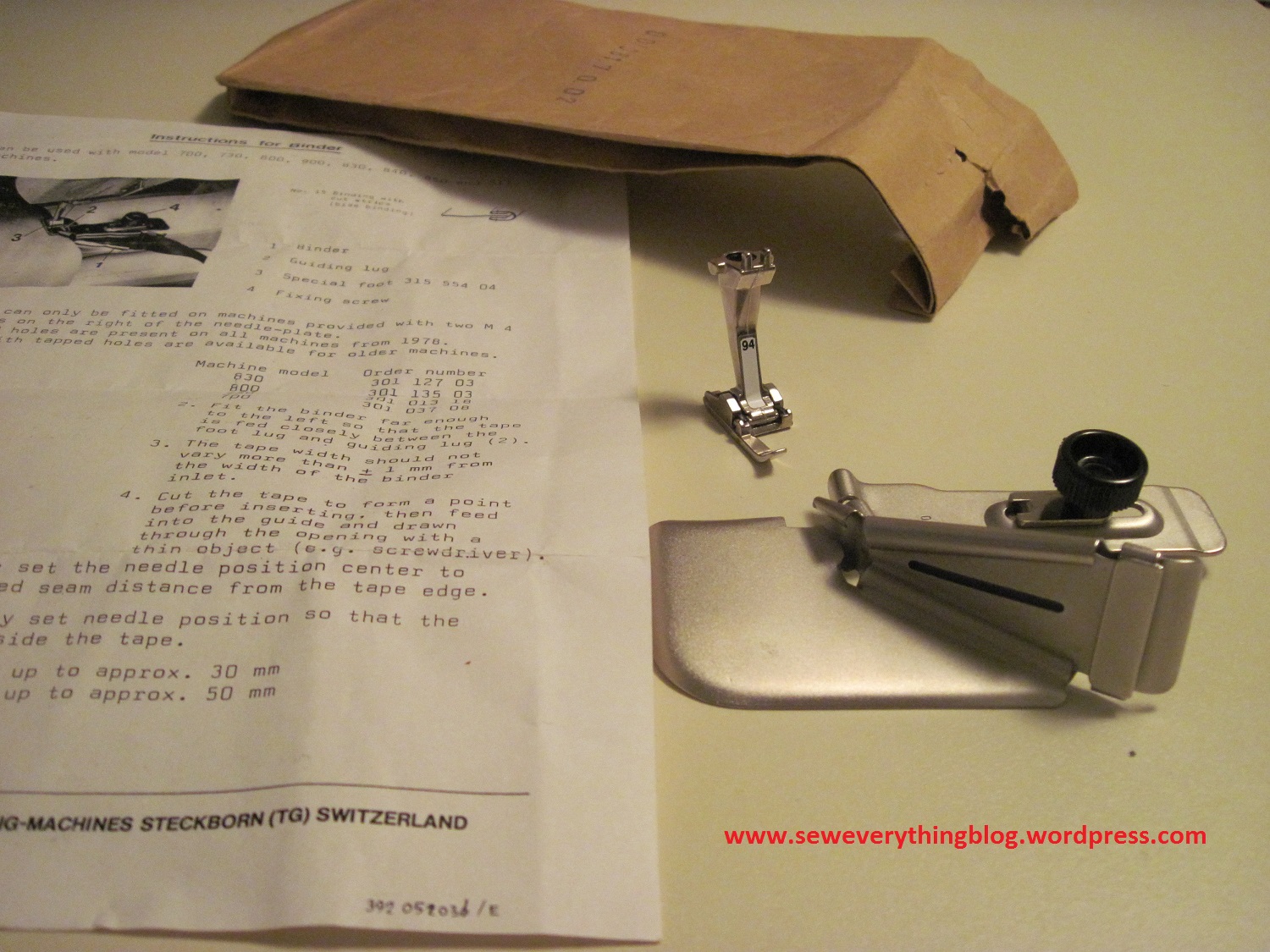 My Binding attachment has 2 parts: the weird L shaped guide (and you don’t know why it is shaped that way until you actually use it) which attaches to the machine with a pin and a screw. The other part is the presser foot #94 which looks like a one-legged creature and has to be used with the weird guide, #84. I don’t remember whether I had to pay separately for the #94 foot, or it came with the attachment. Charlene, feel free to chime in here, please ….