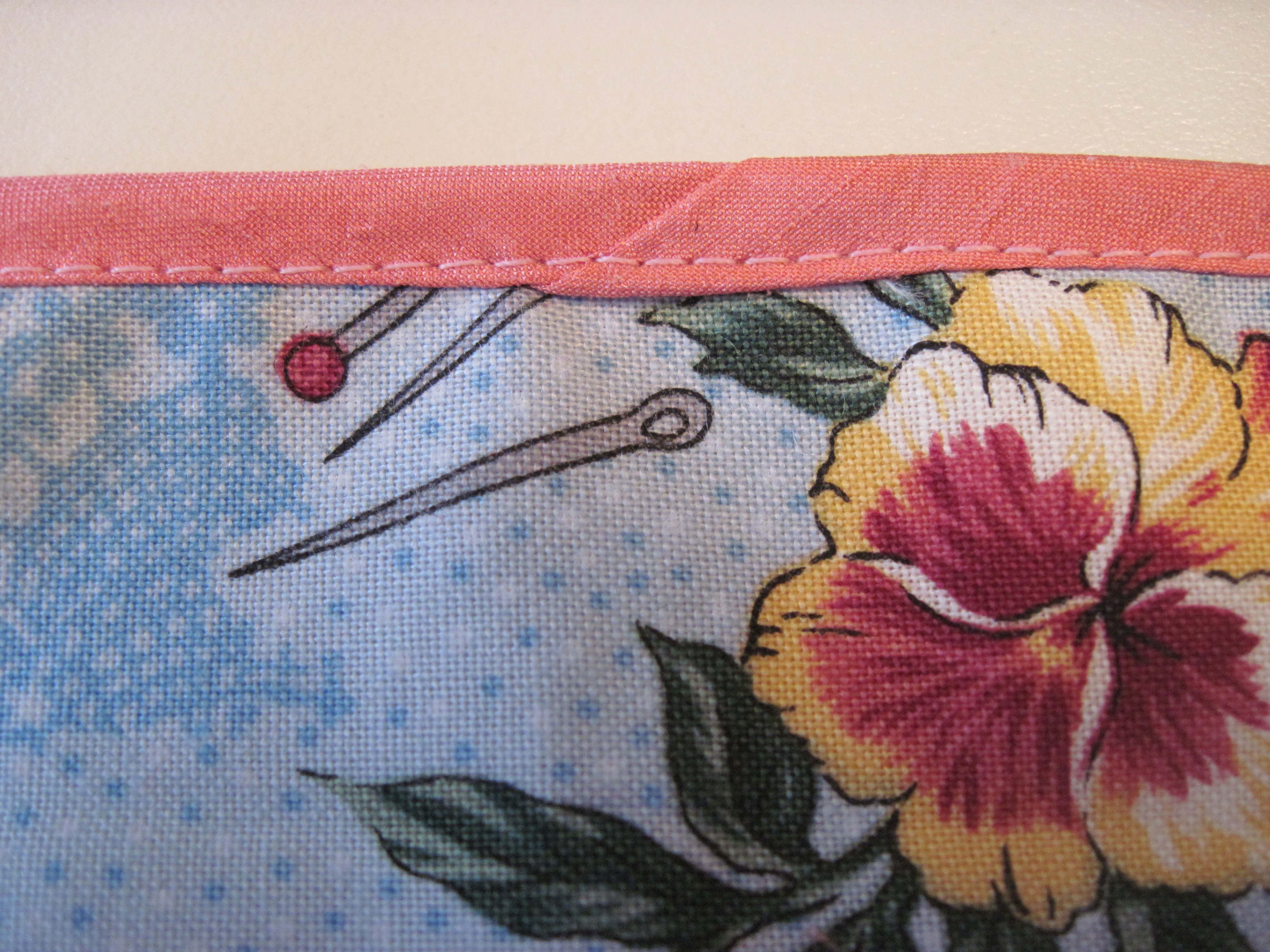 3.  If binding a quilted project, it helps to sew a line of stitching around the edge to be bound, about 1/8″ away from the raw edge.