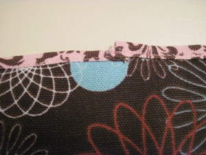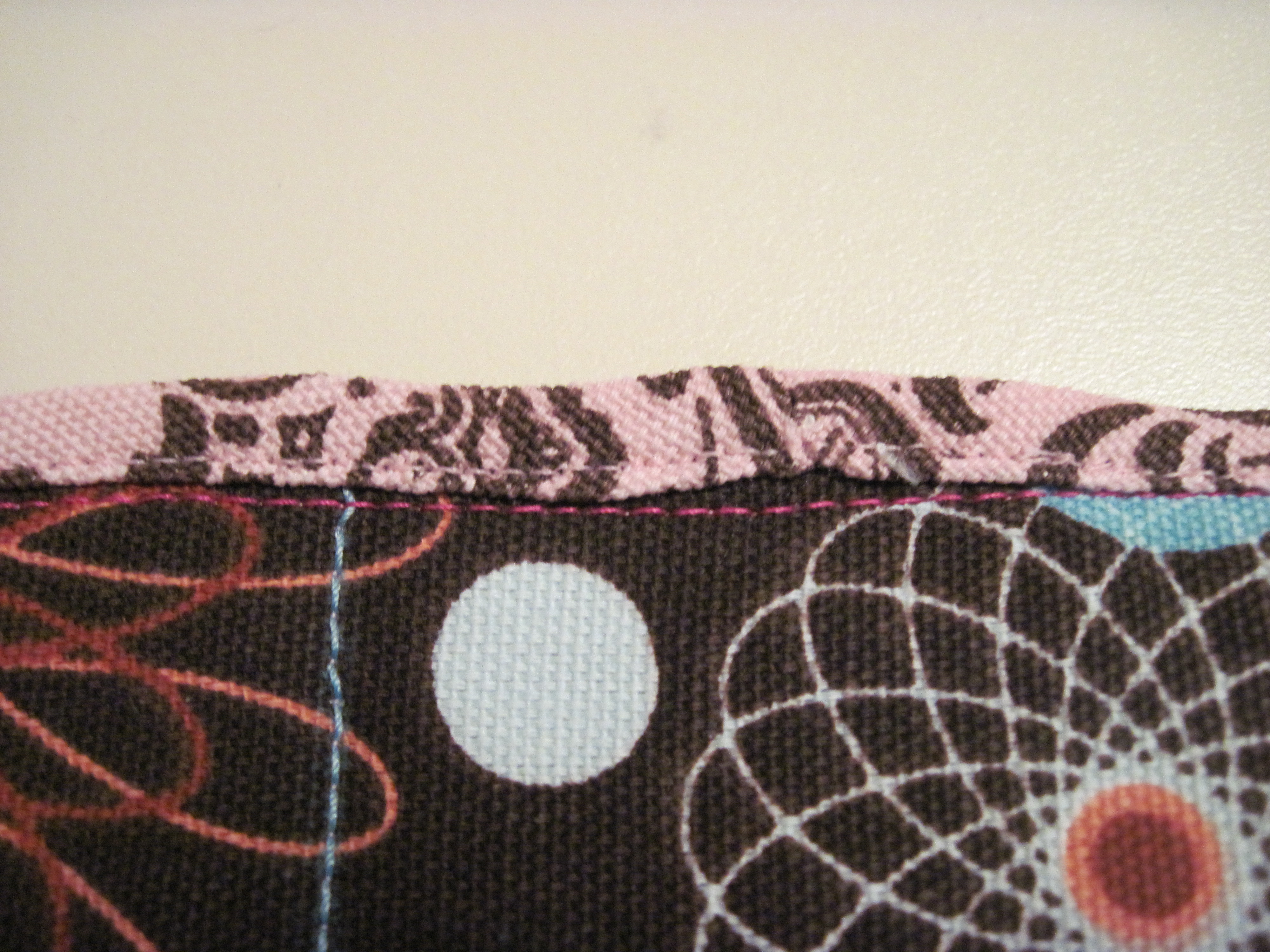 10.  Need to piece the flat bias tape to complete the project?  You can, but not with anything heavier than a thin cotton or a silk taffeta or fabric of similar weight. My home dec fabric in the picture is not heavy at all, but the joint seam did not go through the guide at the point where it gets folded.  The joining seam in the pink silk taffeta tape sailed right through!