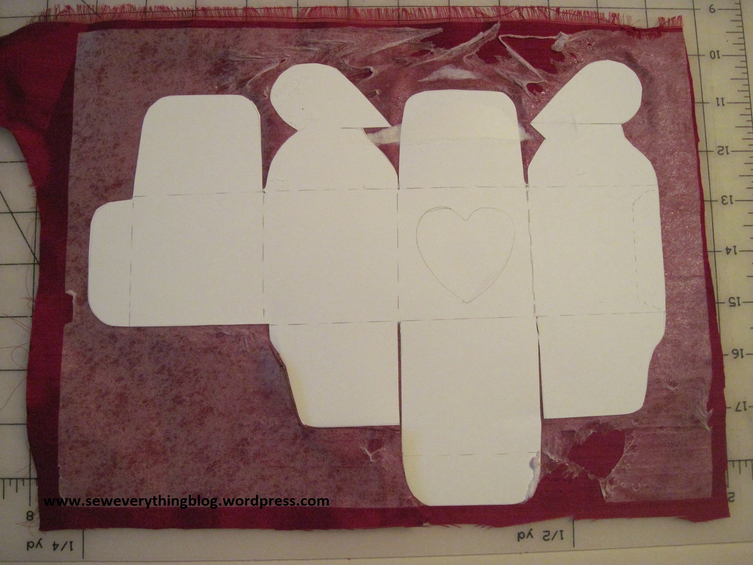 These are the supplies I used: the pattern sheet (Hancock freebie from years ago), scarlet red silk dupioni, posterboard template, Pellon EZ Steam II (double sided fusible).  Not pictured: glue, scissors, exacto knife to cut into tight corners and a Hera marker (or similar thing) to lightly score the fold lines.