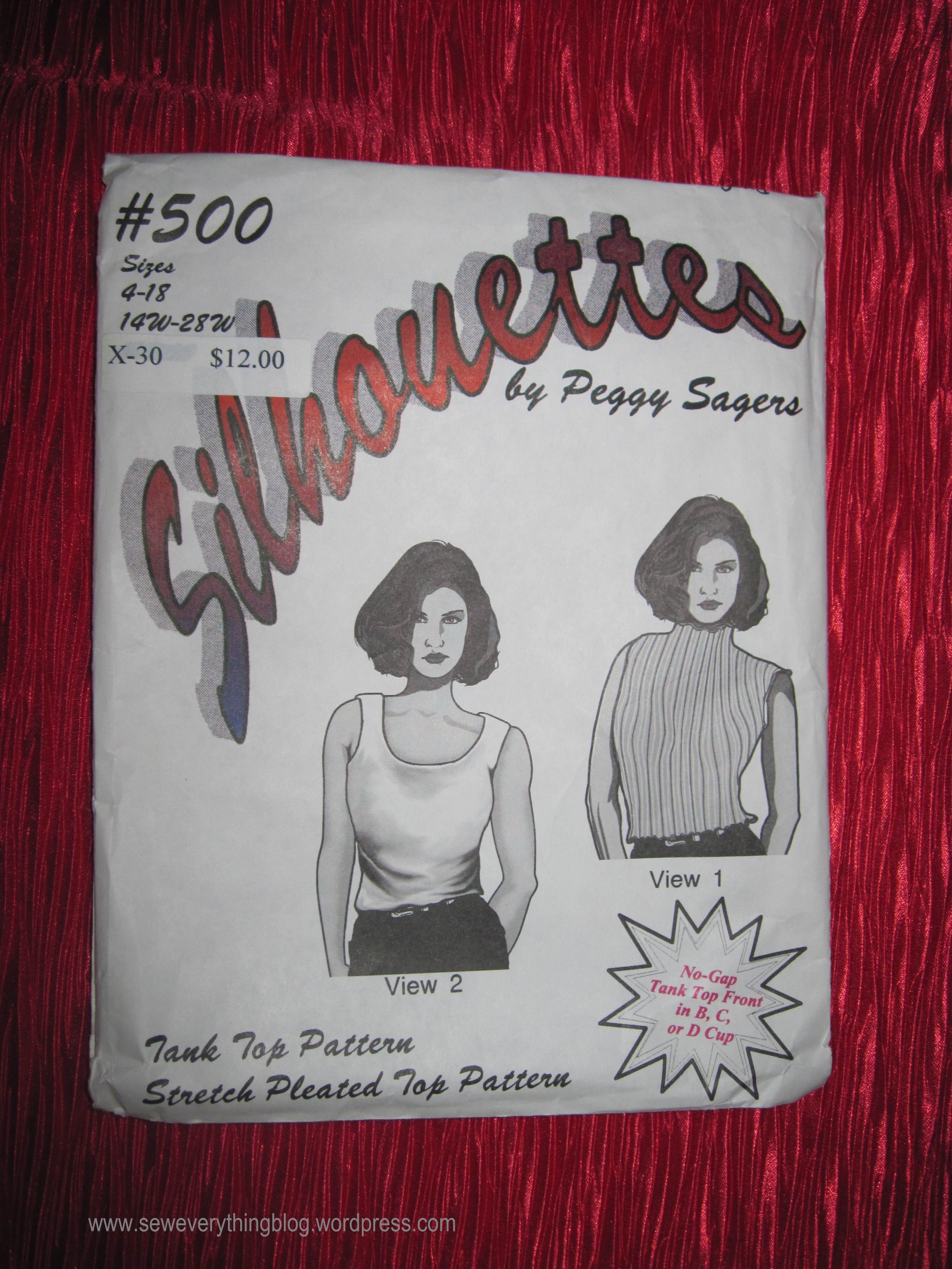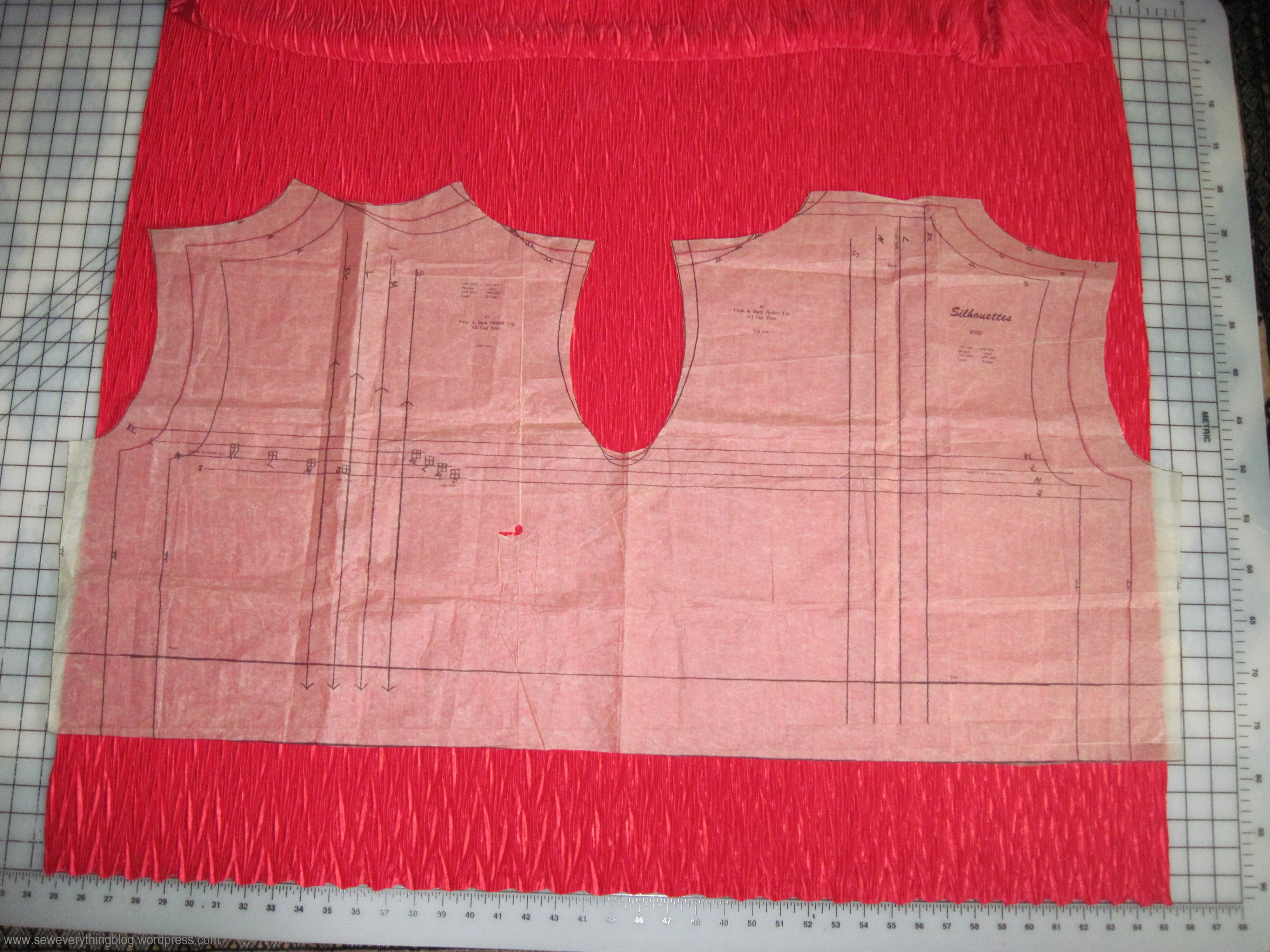 A recent dive into my fabric and pattern stash turned up this blouse pattern designed by the fabulous Peggy Sagers owner of Silhouette Patterns, plus some red pleated fabric purchased together, waiting patiently for me to re-discover them. This duo goes back to the turn of the 21st century – 14-15 years ago. Yep, the new pattern envelope has live models and everything (click on the link above). I told you I bought the pattern, oh, probably when it was first published.