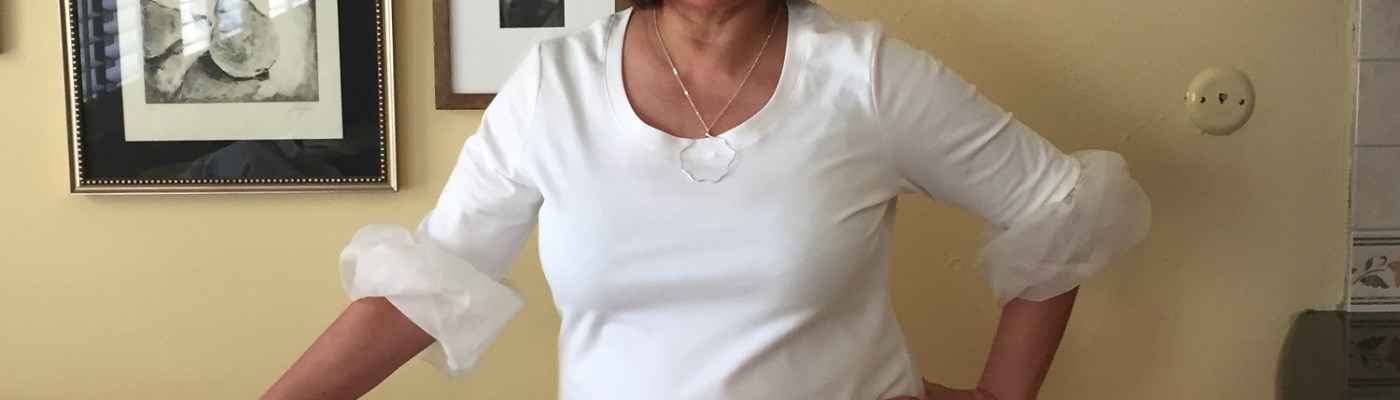 Fabric Used: Not sure what fabric was used in the original design, but I bought creamy white cotton/lycra from Sew Much Fabric which they call in Swiss Cotton Knit. It is a tightly knit cotton/lycra. The ruffle detail is silk organza with a tulle underlining for dimension.