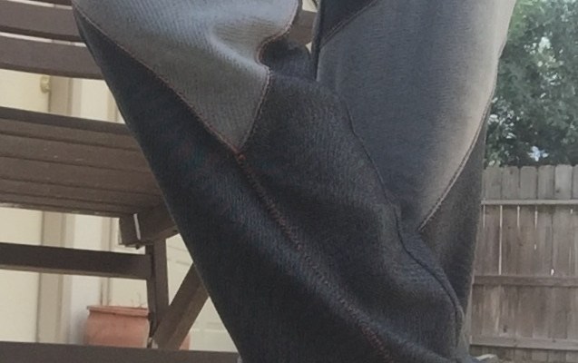 Now that I’ve sewn up 5 pairs of these pants in recommended ponte knit, I thought I would throw caution to the wind and make a pair in a stretch woven fabric for the 6th pair. Although they’re both stretchy, the ratio is very different in the two fabrics; my stretch-wovens did not stretch in the lengthwise direction, and has less stretch in the widthwise direction (depending on how much lycra was woven in).  I won’t bore you with the percentage of stretch and all that mathy stuff.