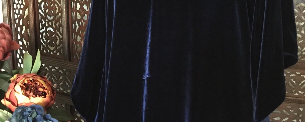 That is, until I heard it being exalted by my friend; then, I looked at it with new eyes and pulled out a long-stashed navy blue silk velvet to make another one; and another in a “rug” print rayon, more about which in a future post.