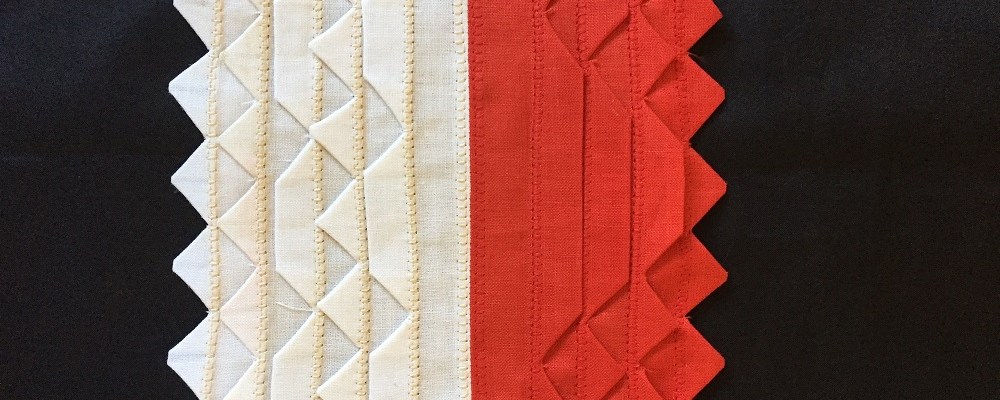 The key to success lies in the accuracy and uniformity of the tucks. Mark tuck lines (they’re actually fold lines) perfectly on grain, using this formula (from Linda Chang Teufel, author of Fabric Origami): width of tuck x 3 + 1/8”=distance between lines. Therefore, to create ½” tucks, the distance between the lines should be 1 5/8 inches. This assures a ½” tuck plus a bit of “turn-of-the-cloth” ease, and allows the fold of the tuck to barely reach the bottom of the next tuck (after pressing down). Fold on the line and sew ½” away from it – there’s your tuck. Repeat on other marked fold lines. Press well.