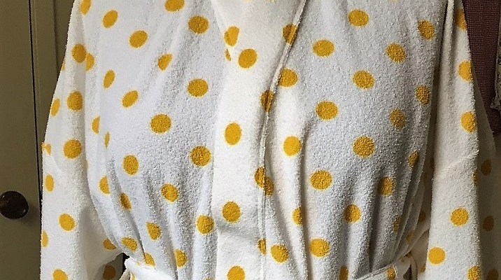 In the interest of stash busting, I used a long-aged cotton terry cloth. The pattern guidelines recommend using a contrast front band and belt, but there was no suitable contrast in my stash, and the robe was a “use-what-you-have” project where buying new stuff was a self-imposed restriction. To wangle out fabric for a belt, I cut away a few inches from the hem, because the robe was way too long for the wearer anyway and chopping of a few inches all the way around yielded a belt.