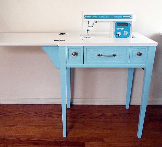 Hey friends, the best feature of a sewing machine cabinet (a sewing table) in my opinion, is the large surface that is flush with the bed of the machine. Why is it good to have that feature? Because your project does not hang down on the other side as the seam moves on. Here’s an image of a cute cabinet from Pinterest, and it has the machine bed flush with the table surface; it should extend out more, though.