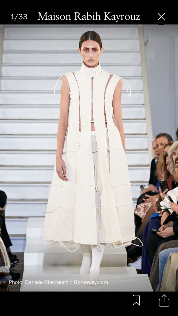 Maison Rabih Kayrouz: I admire innovative garment design which is also wearable. This one has an attractive nautical-rope touch to it. Something tells me you can pull the cords to bring it closer to the body. The general look can be considered nautical or “primitive” – whichever way you want to look at it.