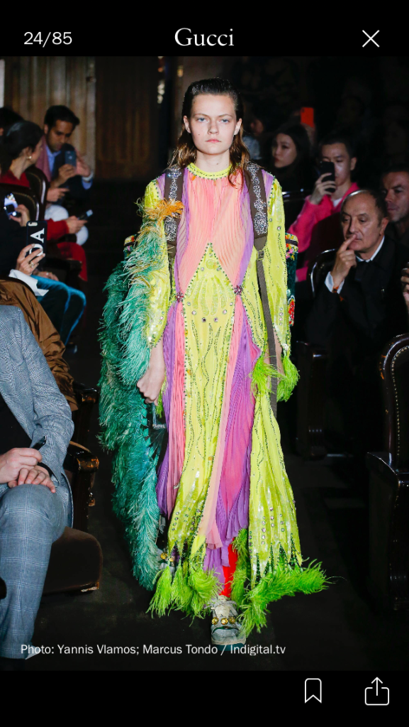 And then there’s Gucci, always edgy. There’s interesting use of pleated fabric but gives off Issey Miyake vibes. Come on, Gucci, do something no one’s seen before (sounding like a Project Runway judge). I do really like the multi-hued feathery piece.
