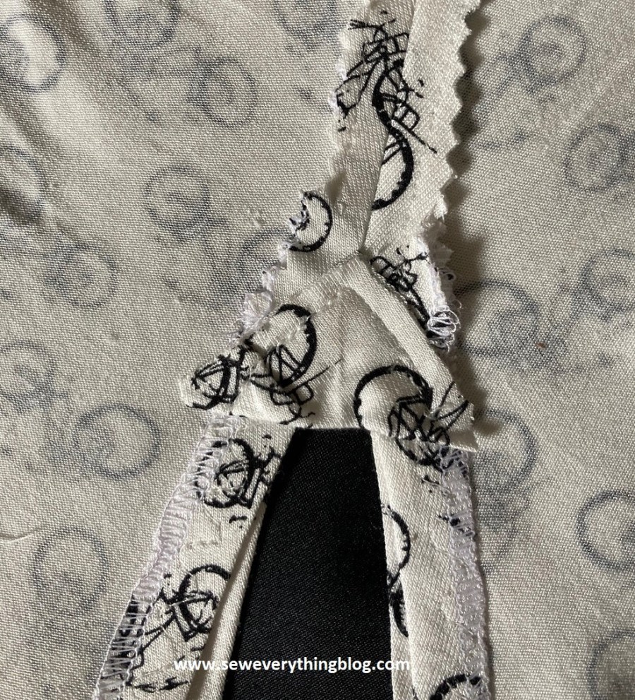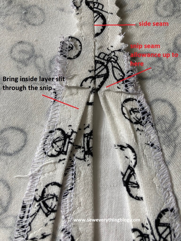 Make a horizontal cut in the seam allowance where the side seam ends and the slits begin; cut only in the upper (public side) layer of fabric. Adjust so that the inside layer is under the snip and over the front layer (when seen from the wrong side of garment).