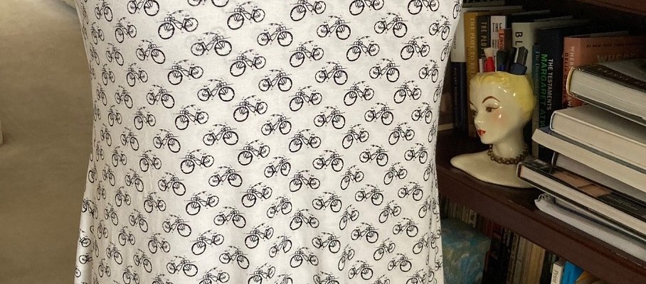 I love how it turned out, and did I say I love the bicycle print? Fabric source: Islander Sewing Systems . I’m not certain they still have this fabric, but feel free to take a look. They have a live Facebook event every Tuesday which is extremely informative; even though I am not able to join each time, I recommend it. (No business affiliation with Islander Sewing Systems) .\