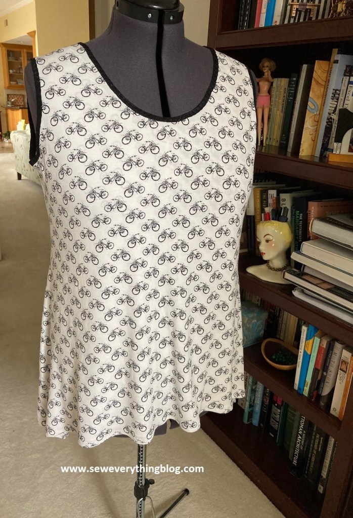 Making things more complicated: we seamstresses have more good/bad ideas in our heads than we know what to do with.  This tank is designed with no extraneous details, with the raw edges left as is at the neck, armholes and hem; a very fast sew with two shoulder seams, two side seams, throw it on and go out the door.  Until you remember that most knits curl up when left without a sewn hem. I’d love to get my hands on a non-curling knit.  For this bike print jersey, it was a good idea to finish every edge: foldover elastic at the neckline and armholes and a sewn hem.