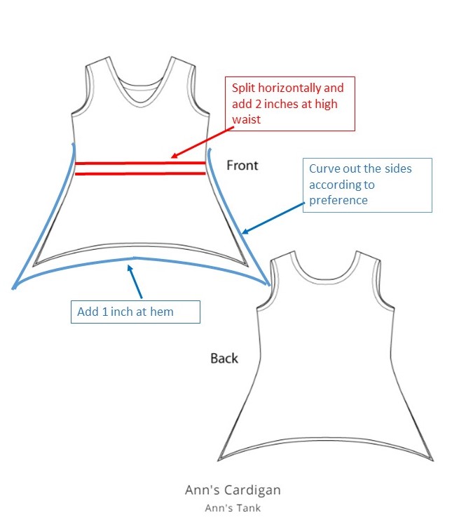 I used the tank top pattern to make my knit top; it’s drafted with a flare on the sides, but I decided I wanted 3 more inches in length and a more pronounced flare on the sides.  This graphic below should explain how I made it a more pronounced flare, but feel free to ask questions, or chime in with your own idea. Line drawings from the The Sewing Workshop website but I added the red and blue markings. Many thanks in advance to Linda Lee and The Sewing Workshop.
