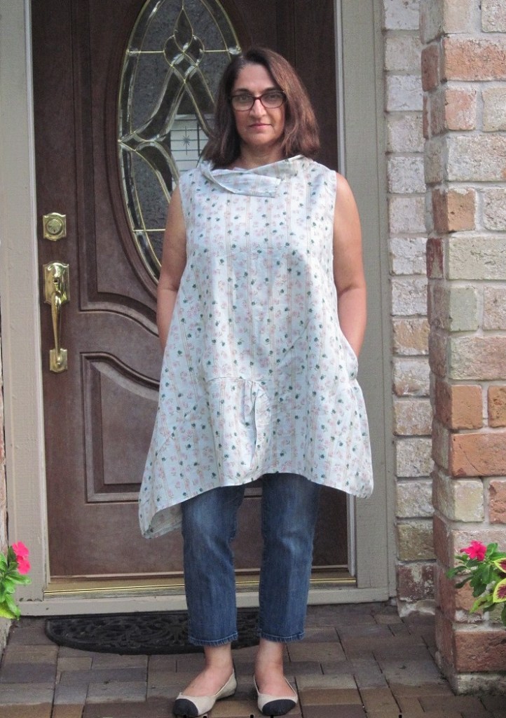I’ve made a top or two in this shape since oh, 2015, and still wearing them. As you can see in this old picture where I was five years younger (the ravages of time are obvious), I paired the tunic with narrow jeans.