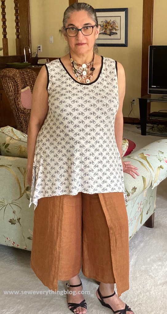 The top is a lengthened and flared “Ann’s Tank” from The Sewing Workshop. You’ve seen both these pieces in previous posts but not together and not on me. Well, here I am, going all natural with the hair. Bonus: the comfort level of my flowy “Mirage Pants” (CamiMade pattern company) is sky high, and that makes it ideal for staying home during the age of covid-19, and presentable enough for must-go-out errands. The pants have a lovely “flow” when you walk — a definite plus!