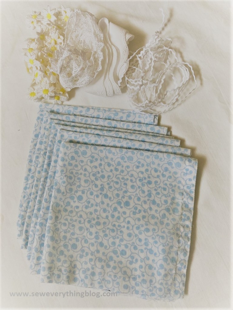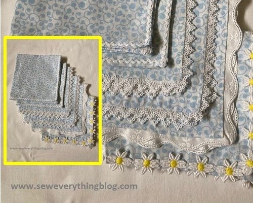 The ric-rac and flower edging were stitched on top of the napkin edge; and the tiny tatted edging was sewn with it’s straight edge on the wrong side of the napkin so that the “picots” peek out from behind. All of them attached with a zig-zag stitch. Notice that some napkin edges were already sewn from it’s life as a garment, and I used those pre-finished edges to my advantage.
