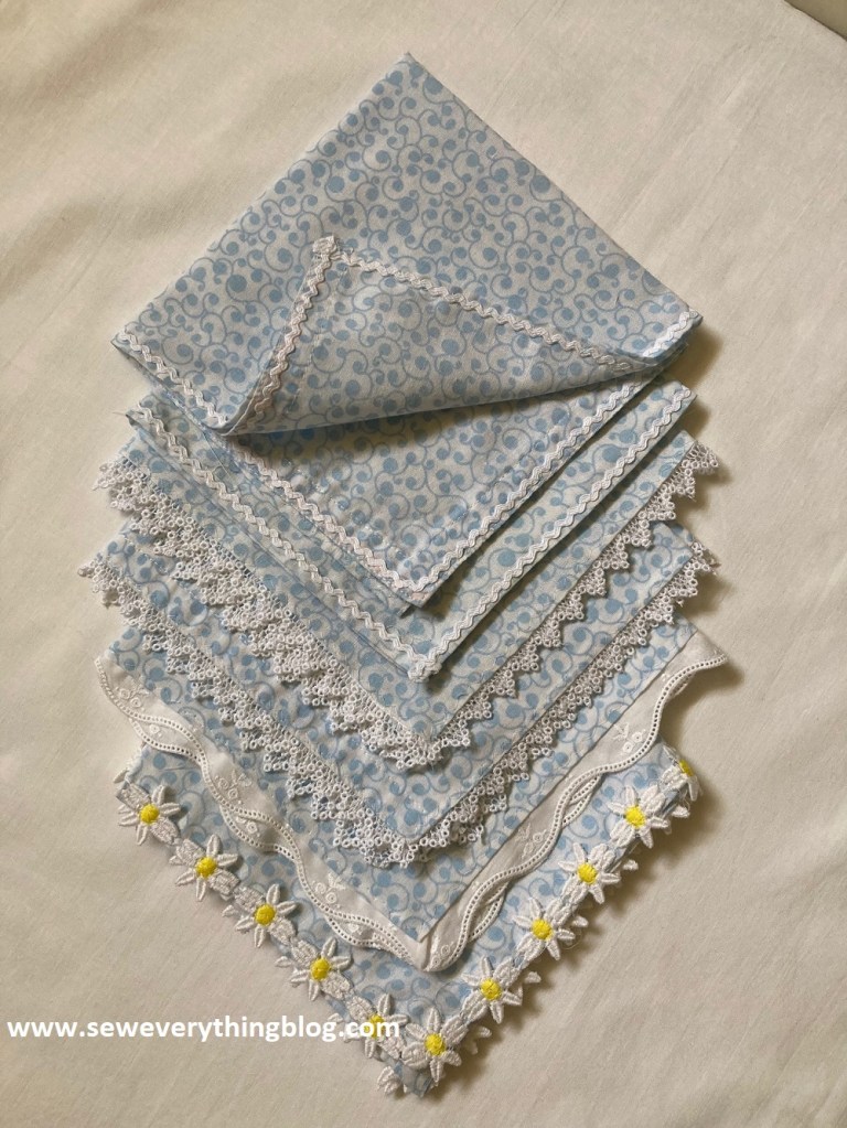 Hi friends! I completed this long forgotten set of napkins with white lace edgings. Cream, ecru, beige laces would not work for the dainty blue and white print. Thus the mismatched set of edgings because this is all the white laces I had in the stash.