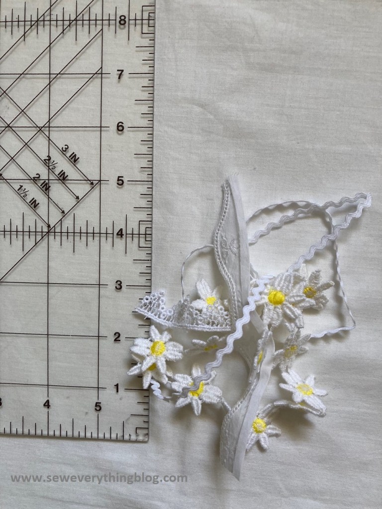 To complete the no-waste vibes of this project, what will I do with the tiny scraps of lace leftover from edging the napkins?  Why, use the bits to sew into waistbands to indicate the back, of course.  Done. This was fun!