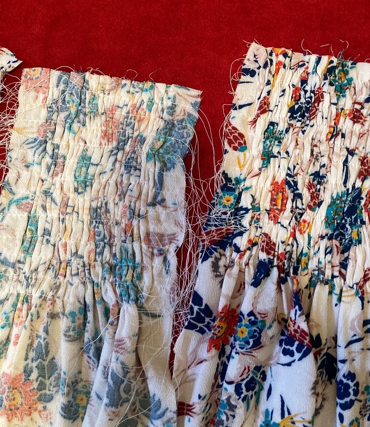 How much Fabric? Shirring is a somewhat tightly gathered look. Depending on the fabric weight, it has to be at least twice the desired finished size, or at the most three times the desired size, as my shirred piece was. I started with a 12 inch wide georgette piece which shirred down to 3 inches, not including seam allowances. For an inset piece it’s best to make a shirred piece larger than you need, and then cut it down to the inset pattern shape. Watch Ann Ngo’s video to see some hand shirring.