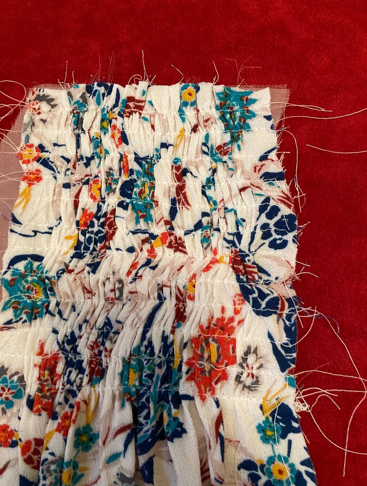 Inspired by Ann’s blouse in the same fabric (video link below) and a RTW blouse by COS (image in a later post), I indulged in some shirring; but after 12 lines of gathering on each piece, I let the bottom fall into gathers. Complicated? Where do these shirred pieces (above) go anyway? All will be revealed soon. For now, let’s obsess over shirring. I have never before used shirring on any sewing projects for me or mine. So chime in if you have any tips!