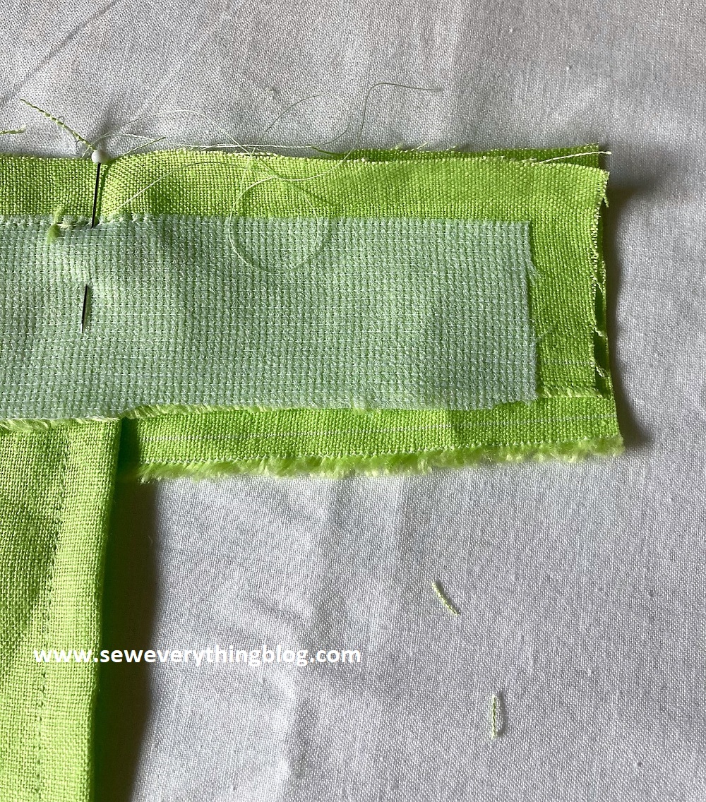I cut small rectangles, the width of the facing/waistband and enough length to overlap the inside edge so that it is enclosed. The stitching line follows the edge of the interfacing, then the seam trimmed and the extension turned to the right side. Is this clear as mud?