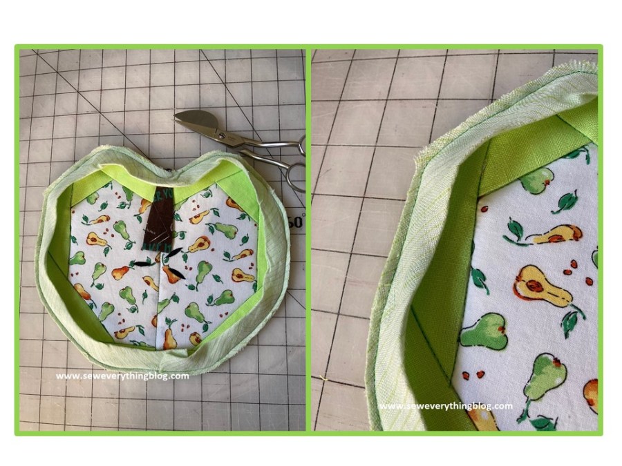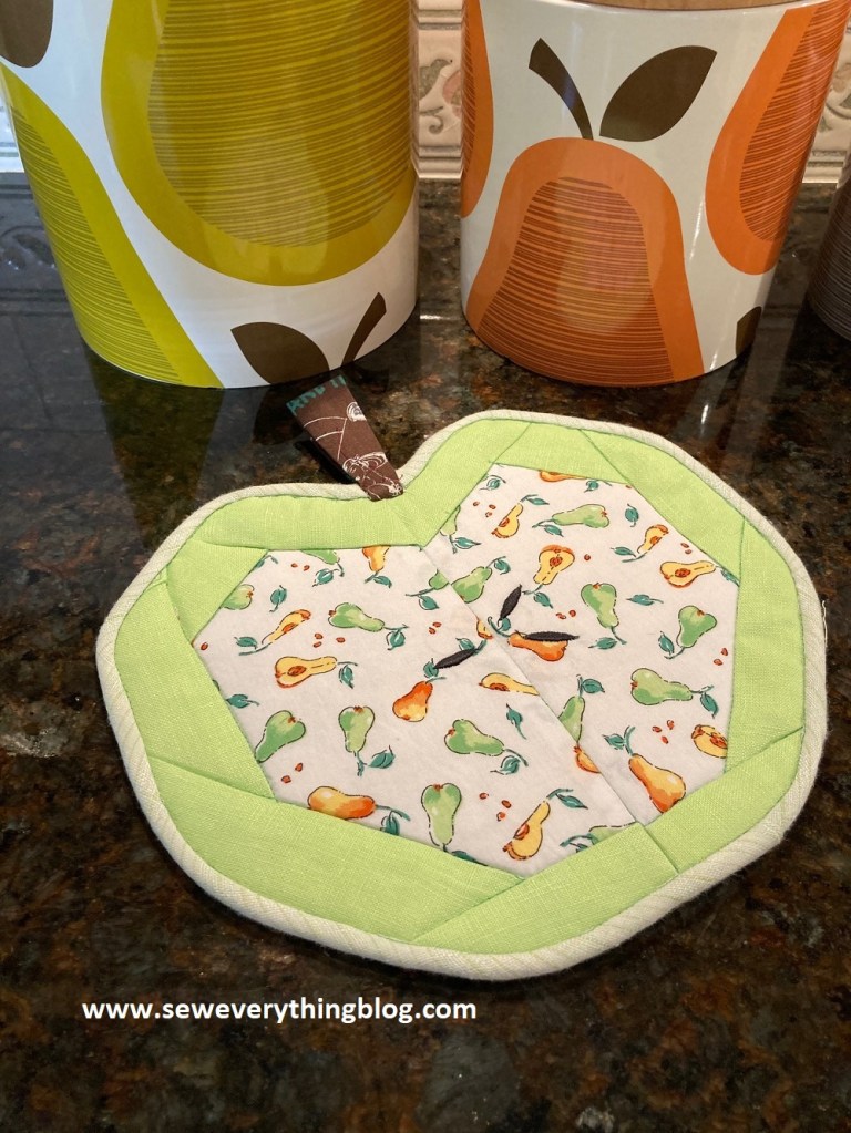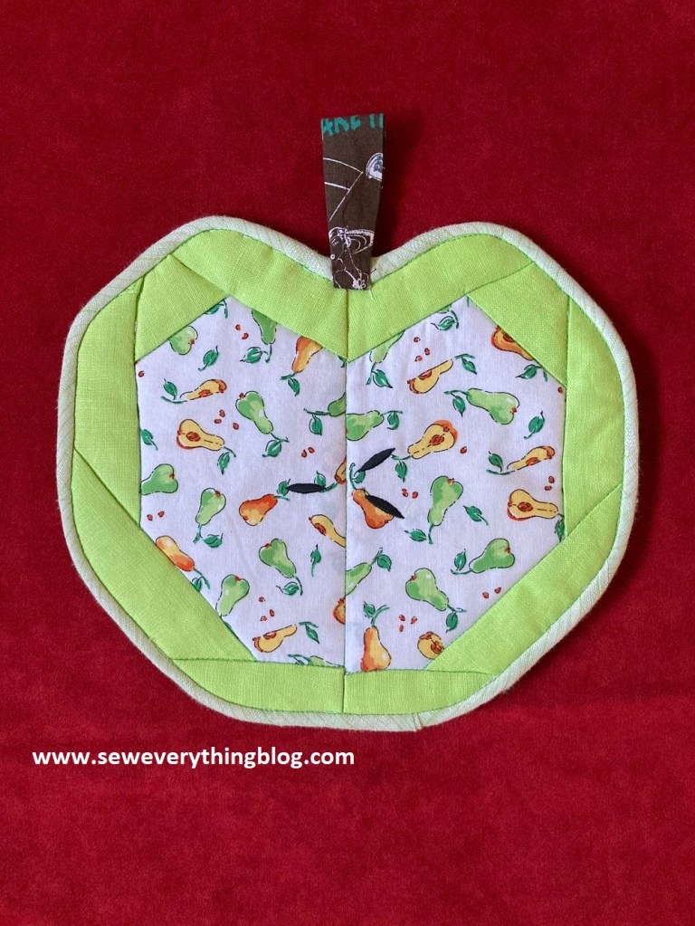 So, here’s my most recent quick and happy make: a potholder that looks like a Granny Smith apple!! It’s my first self-made potholder — you’d think that someone sewing for decades would have made at least ONE in all these years. Well, I missed the potholder milestone. I made this to replace my lonely, old existing one (from Target) was in shreds (be honest, how long do we keep our potholders?). My new one is designed by Charise Randell, made from her instructions in an old issue of “Stitch” magazine, now out of print.