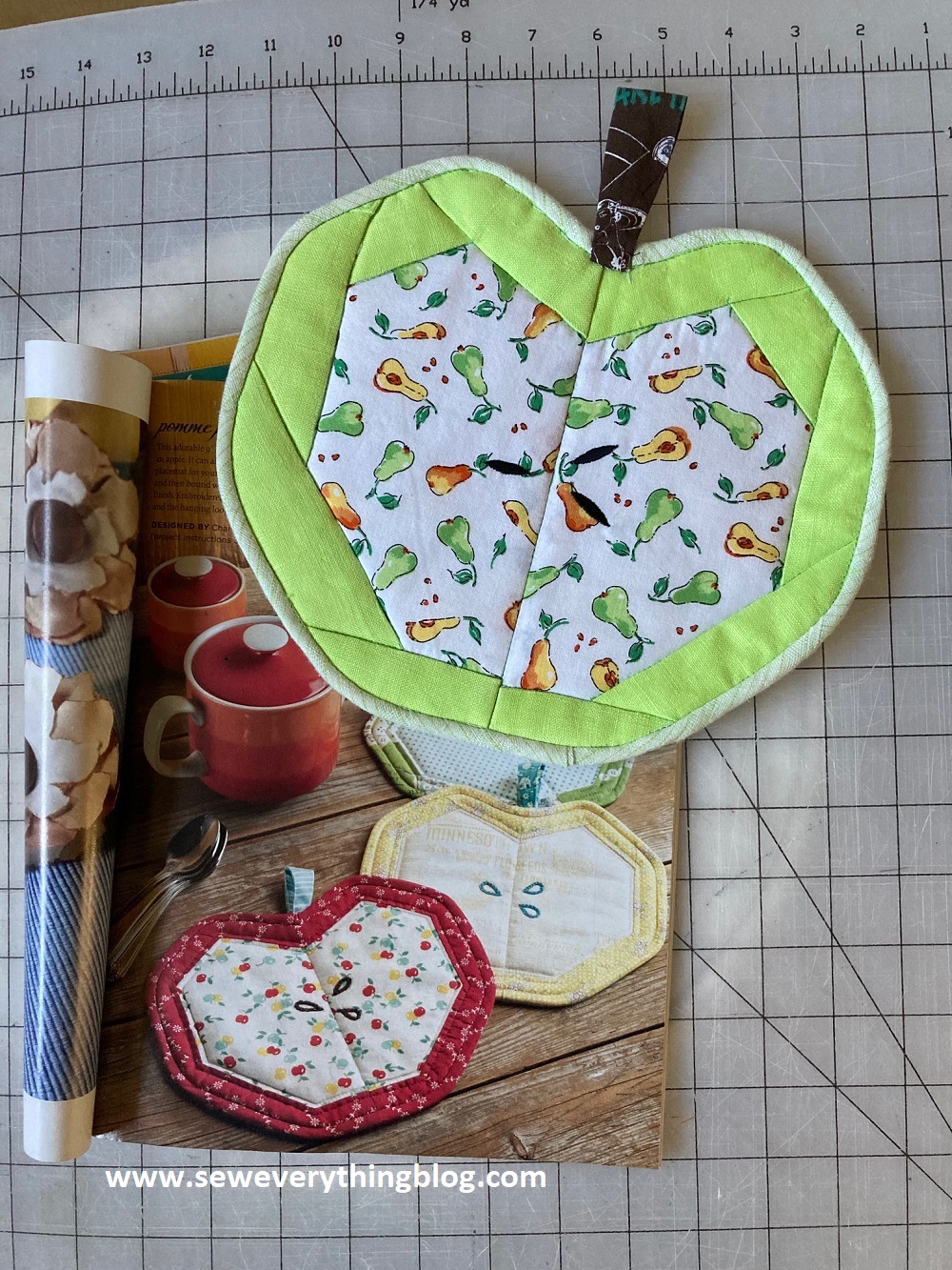 So, here’s my most recent quick and happy make: a potholder that looks like a Granny Smith apple!! It’s my first self-made potholder — you’d think that someone sewing for decades would have made at least ONE in all these years. Well, I missed the potholder milestone. I made this to replace my lonely, old existing one (from Target) was in shreds (be honest, how long do we keep our potholders?). My new one is designed by Charise Randell, made from her instructions in an old issue of “Stitch” magazine, now out of print.