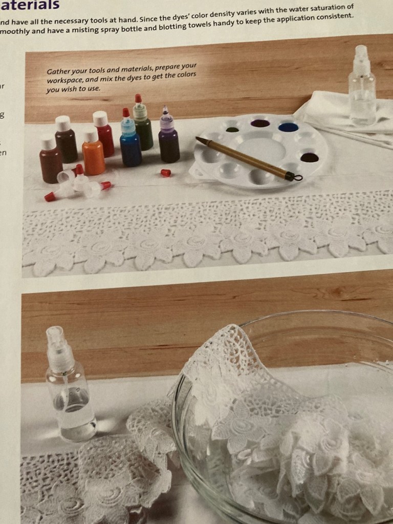 I have inhabited the general sewing community so long that when brand new exciting stuff shows up in 2021, in print or online, it’s the exact same stuff I saw a decade ago. Case in point: this magazine feature on painted rayon lace. I bought my kit many years ago from a company called Sara’s Bloom and never used it even though it popped up in my thoughts occasionally – “oh yeah, I must do something with that”. Here’s a blog post about the company and the owner from 2008 – whatever happened to Sara’s Bloom? Time flew and I’m now ready to use this kit. Thank you for nudging me, dear magazine people and the author of this article. I still want to know what happened to the Sara’s Bloom Company.