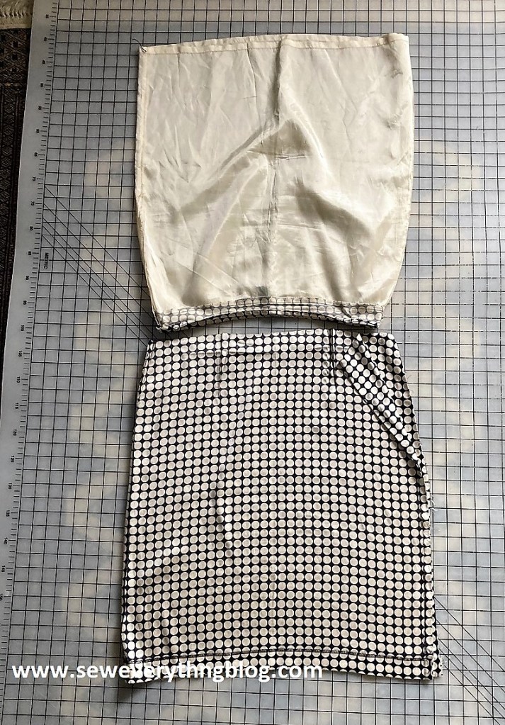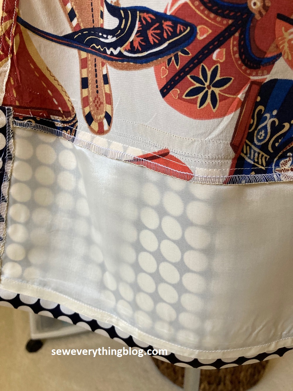The newly added band: just using the lightweight polka dot charmeuse for the bands seemed a little too lightweight and “fly away” – I think you know what I mean. Therefore, I used the skirt’s white acetate lining to mimic the original skirt lining. This will be repeated on the pj pants when I work on them.