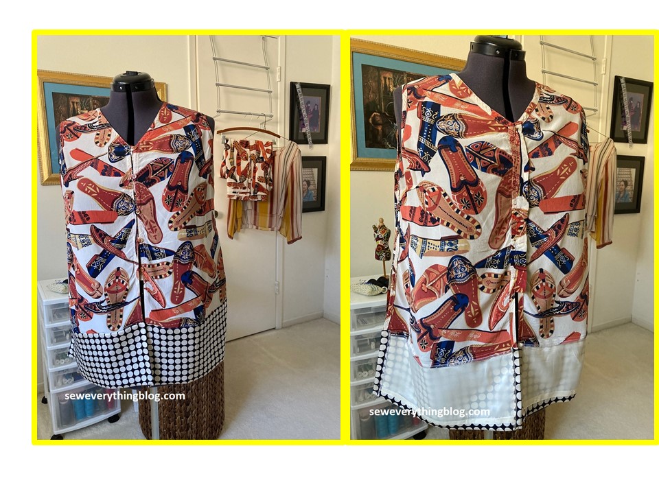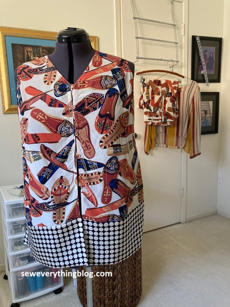 This much loved, self-made blouse (Vogue Pattern by Adri) has been refashioned into a pj top – I did not wear it enough to do it justice. Recently the stars aligned, and with the added polka dot band (harvested from a RTW silk charmeuse, lined skirt) it will see a lot more use. It will match the pajama bottoms that are still in yardage mode. Sigh…