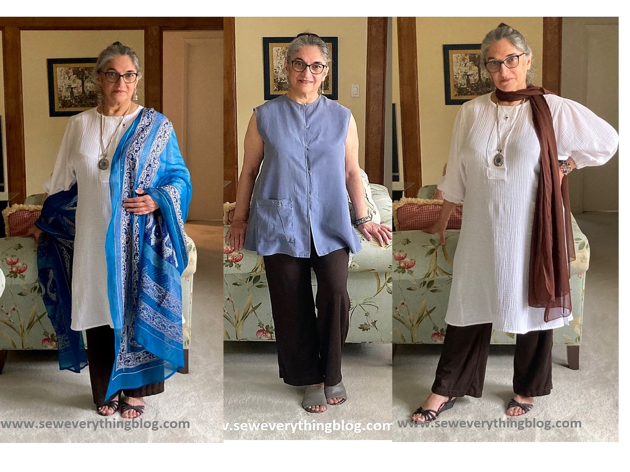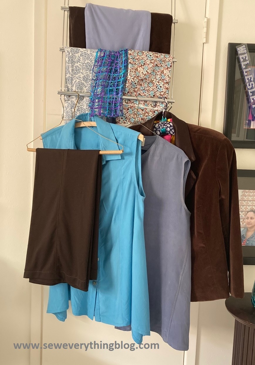 There you have it — one pair of pants and two tops covering two cultural spectrums. And there’s more blue/brown stuff to come; take a look at what’s hanging on the door. What’s not included is my turquoise blue pants and the white ponte pants.