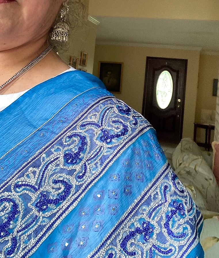 In this post, I’ve dipped my toes in the South Asian ”stylist” pond, to see how one white kurta and dark brown wide-leg pant could go summery casual (right) and then be somewhat dressier with a dupatta switch and silver earrings to get the blingy blue and brown combination that is now my summer go-to palette. Its difficult to see the small shiny bits on the blue dupatta (scarf) so here’s a close-up. The little silver bits are made with very narrow metal strips. It is called “kamdani” embroidery and needs specialized skills passed on by one artisan to another.