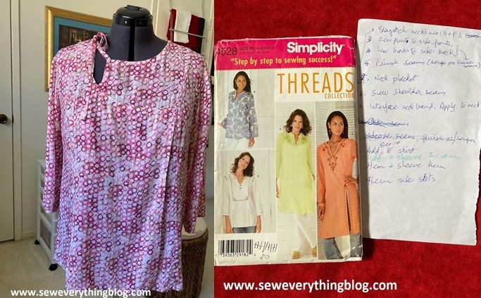 Remember that cheat sheets are the order of sewing at the most granular level; they’re helpful in putting together the shell of the garment.  They assume you know how to add any details that must be worked on in between the sewing order.  For example, the neck treatment of the above Simplicity pattern is the first task after stay stitching the neckline. The cheat sheet will only tell you to “make neck placket” – it assumes that I know how to do that with or without the pattern company guide sheet.