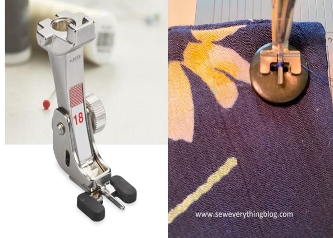 Lets focus on the Bernina button-sew-on Foot #18: It’s a funny looking critter but each little feature has a purpose. Another disclosure: my button foot was purchased many years ago. Bernina has since changed the design and added a useful feature to the foot. (That useul feature was already there in the old version) More on that below.