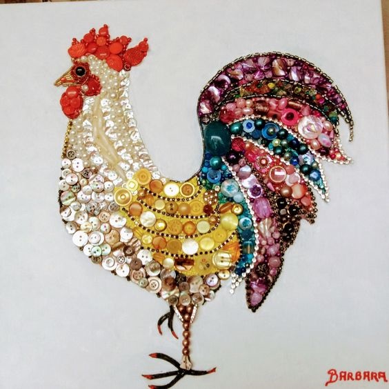 Adorable rooster to potentially use your button sew-on foot! I see buttons, sequins, beads and a whole lot more! Someone named Barbara made this — my heartfelt thanks to her.