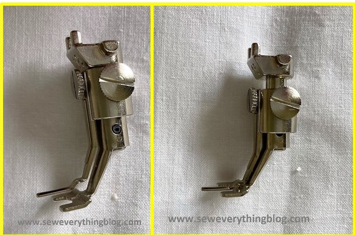 Please accept my apology for not staring at my old button sew-on foot long enough.  Here’s an edit to the last post, where I compare the new Bernina Button Sew-On Foot and my old one — both #18.  A couple of days after uploading the previous post, something nagged at me.  I went back and really looked at and explored my old #18. What do you know, it does have an adjustable center pin. In the previous post I had said that only the new #18 has an adjustable center pin which can be raised or lowered to accommodate thicker fabric where one would want a higher thread shank.  Well, now.  With a twist of a tiny screw driver which loosens two screws, my old #18 also has that feature. Here it is in pictorial form, one shows the center pin at the lowest level, the other is showing the highest.  Moral of the story: look at (really look and research) your machine accessories.