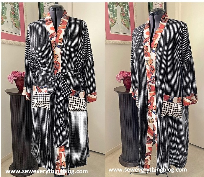 Onto a finished sewing project:  What’s a fancy pj set without a robe? While it’s not a good idea to wear it around in the heat of Texas summers, I do have it if I want to wear it in cooler weather or when there are guests in my home – ever.  I used long scraps from the pj silk and the recycled polka dot skirt to add bands and pockets to the robe. The main fabric is rayon challis from Sew Much Fabric, my go-to fabric source.  This particular challis may be sold out because I could not find it to link it up here. Go there and find other fantastic fabric.