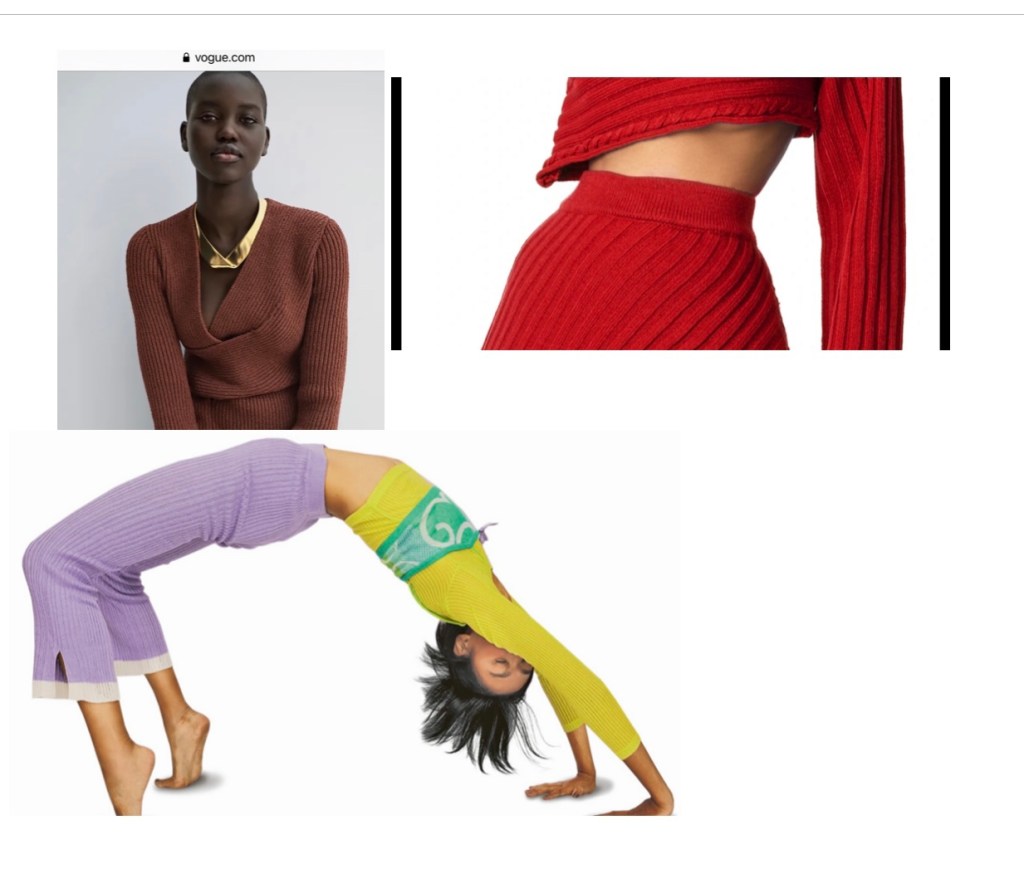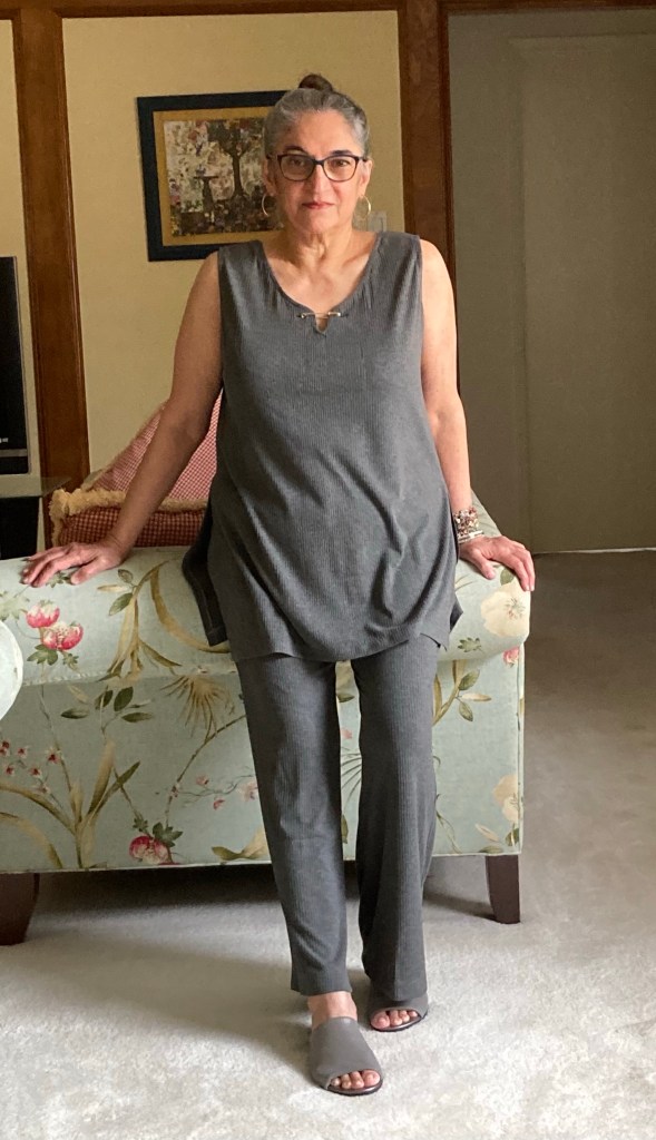 Minimal seams: rib knit garments are designed to take advantage of body curves; this is where they differ from your other garments. It is the wearer’s body that gives shape to a ribbed garment. Therefore, these clothes are made with minimal seams and minimal curves. Keeping that in mind, take a look at the creativity of these clothes. It can be made as a tube and will take the shape of your body when worn. Don’t be scared — it doesn’t have to be a tight fit; it can hug you in the right places while skimming in others. My tunic and pant set is basically a tube, except for the armholes and neckline.