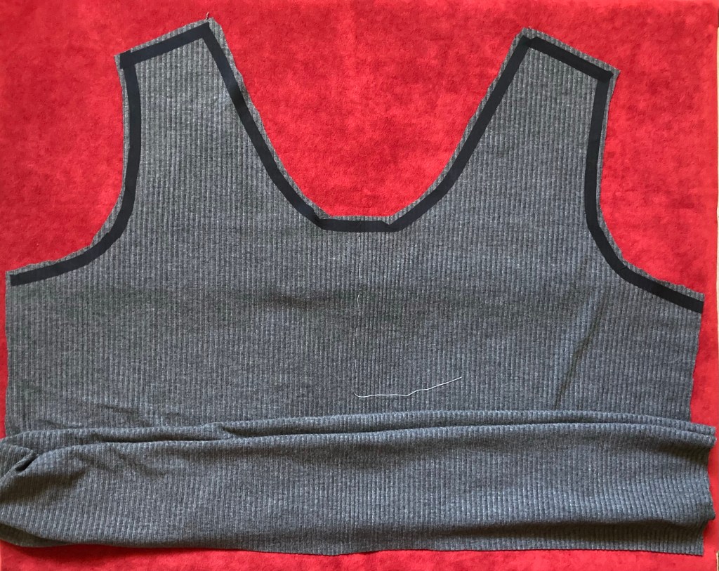 All other sewing processes are the same as any knit fabric: use a jersey or ballpoint machine-needle, narrow width zig zag stitch, stabilizer tape on the shoulder seams. I used a bias stabilizer tape for the neckline and armholes as well. After these basics are taken care of, you can whiz through sewing your rib knit.