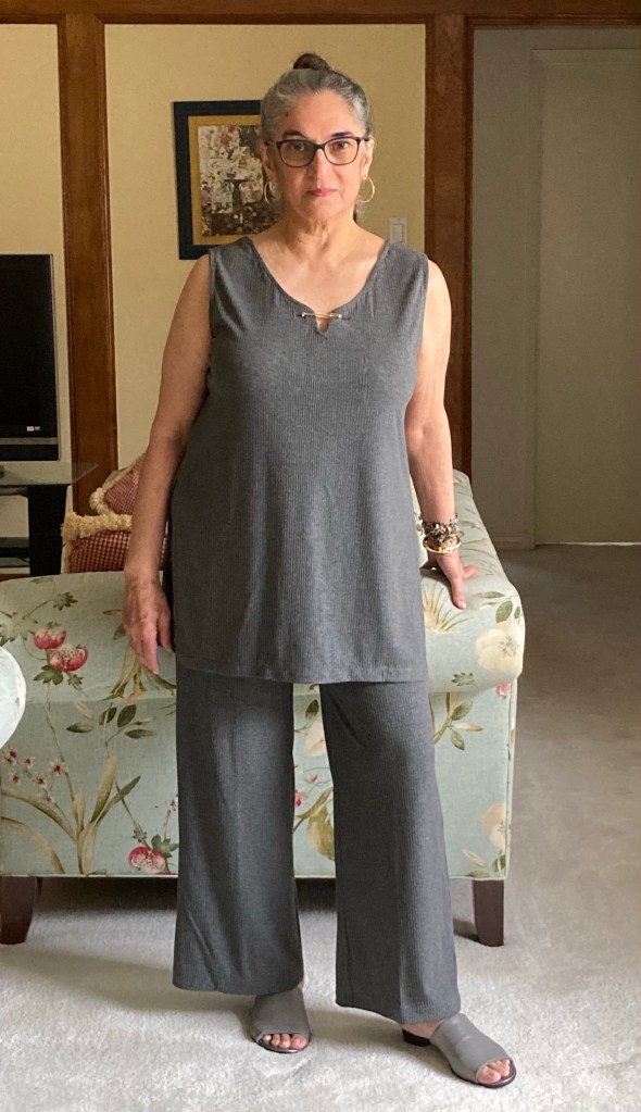 I love your gray ribbed outfit: it is flattering and suits your coloring.