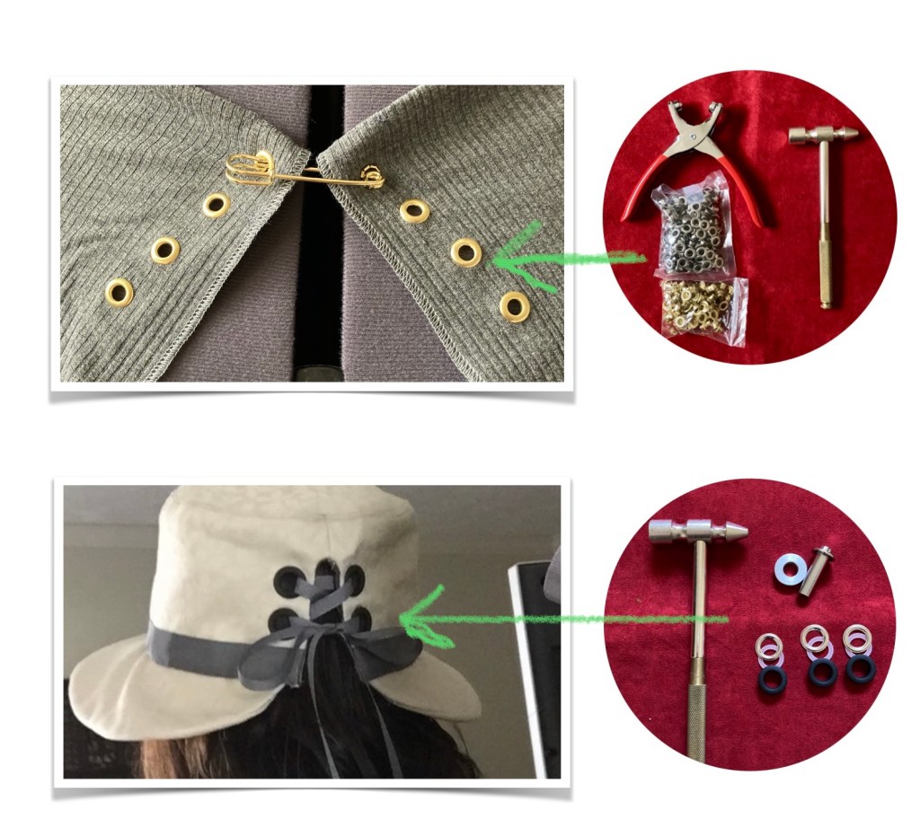 But, stop right there — let me disclose that I’ve used large plastic grommets on curtains and other projects in lieu of tabs or casings to thread and you can read that post here. I’ve also used a few grommets on a floppy-ish hat to thread a ribbon through (see image below or read the full post). In this post I’m referring to the previously “edgy” look of small gold or silver grommets (aka eyelets) either as pure embellishment or to hold two edges together with a fancy pin meant for this purpose. Mind you, I’m just dipping my toe here, but am inspired to take it further.