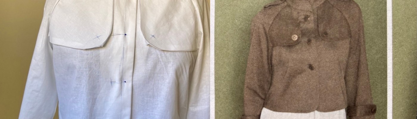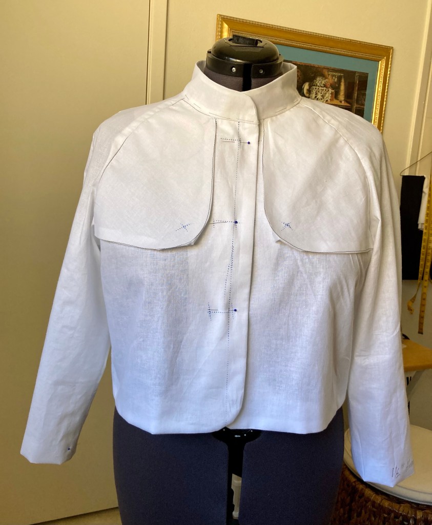Optional Details eliminated: For this particular piece, I ignored the purely aesthetic details and kept what was essential to getting a good feel of the garment, including the fit and the general vibe — should we call it “chicness quotient”? I ignored the shoulder tabs (epaulettes), sleeve wrist tabs, facings for the front chest flaps, buttons and buttonholes. If this jacket closed with a zipper, I would add it to the muslin, though. (It depends on where the zipper is located in the pattern; a front zipper closure can be marked and pinned at the center front marked line to gauge the fit, but how would you pin a side zipper? ). Also ripe for elimination from a muslin is the interfacing.