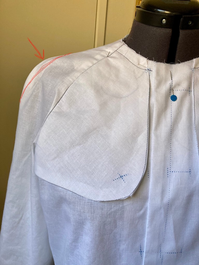 So what fit and aesthetic anomalies did I notice in this muslin? My only fit and silhouette adjustment was to redraw the seam in a small portion of the shoulder area of the raglan sleeve. That area looked too pokey and outward jutting, which I tamed by resewing a shallower curve. See photo below.