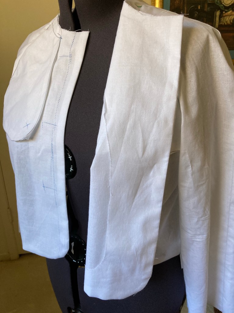 Inclusions : I kept the actual front facing since it is integrated with the hem, and a finished edge of the front is essential to gauge a feel of the garment. I also included the collar and collar facing, since it’s also essential to the look, although I almost forgot the collar until I started writing this post. Heh. The sleeve hem and jacket hem is just folded up and pinned without sewing them down to allow for length adjustments. I would not eliminate a hem completely. The back pleat is a definite inclusion, not just to measure the vibes, but the actual fit ( as in, do they fan out too much?)