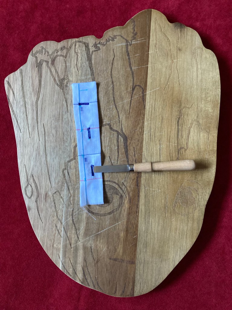 In the kitchen I used my a new wooden board mainly for cutting produce type stuff, or slicing bread. Until it got a good scrubbing, and was used for slicing open buttonholes. There are two more chopping boards dedicated to kitchen work, so it was never missed there. I’ve had enough with the 2 inch (or less) wood pieces that are marketed with the buttonhole chisels and get all gouged with repeated buttonhole cutting in the same spot; the larger kitchen board will eventually get gouged out with use, but at least I can place the entire buttonhole strip on it and make fast work of slitting open the buttonholes.