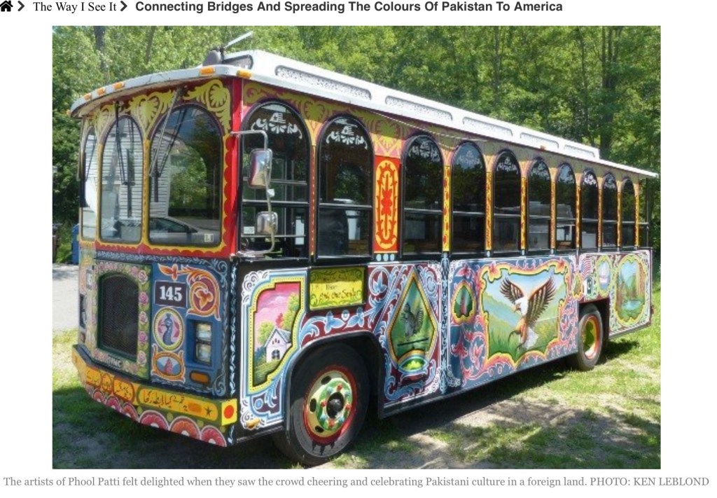 More recently, children of a Tennessee elementary school got a lesson on Pakistani truck/bus art. A Chattanooga art group, A120 organized the event featuring a painted Chevy truck. Talk about cultural bridges! In the photo the truck is painted by artist Haider Ali (who has also painted a truck in this genre for the Smithsonian) and was displayed at the Chattanooga kiddie art event.